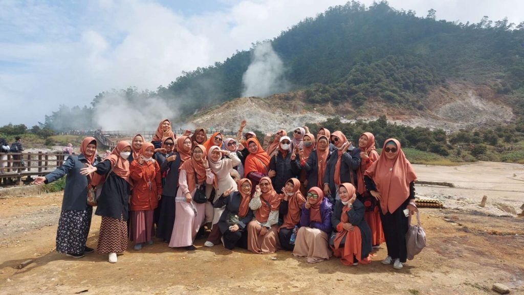 Perjalanan berlanjut ke Kawah Sikidang Dieng. Dengan menyusuri jalan setapak tidak menyurutkan semangat guru-karyawan SD Muhlas untuk tidak melewatkan sedikit pun momen dengan mendokumentasikan melalui handphone masing-masing.