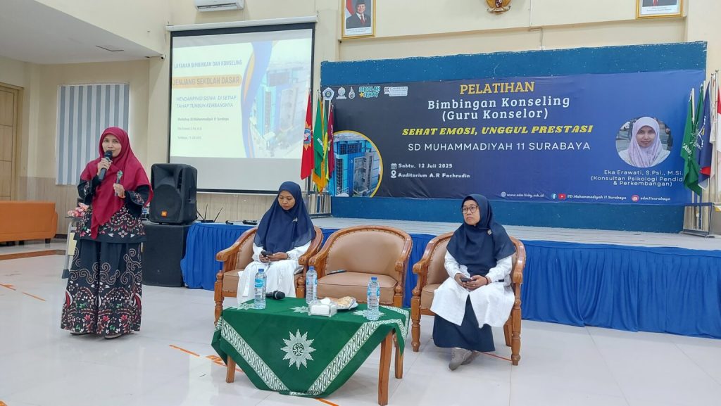 Dalam rangka menyambut tahun ajaran 2025–2026, SD Muhammadiyah 11 mengadakan Pelatihan Bimbingan Konseling (BK) bagi seluruh guru pada Sabtu (12/7/2025), bertempat di Aula AR. Fachruddin. Kegiatan ini mengusung tema “Sehat Emosi, Unggul Prestasi” dengan menghadirkan narasumber profesional, Eka Erawati, S.Psi., M.Psi., seorang konsultan psikologi pendidikan dan perkembangan.