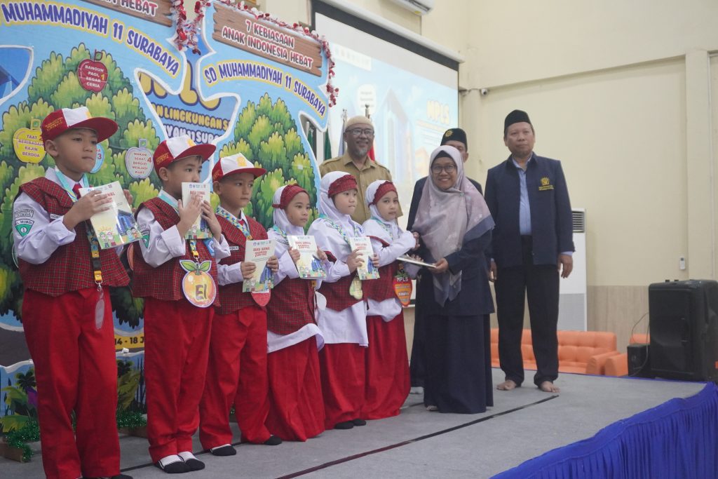 Di akhir acara, secara simbolis diluncurkan buku 7 kebiasaan anak Indonesia hebat dengan membagikan bukun tersebut ke seluruh siswa. (Muriyono)