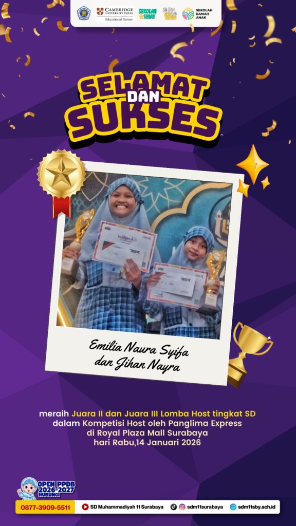 Lembaran Resolusi 2026 TIM Jurnalistik Muhlas dibuka dengan Alhamdulillah atas prestasi yang diraih ananda Emilia Naura Syifa (5 Al Hakim) Juara 2 Lomba Host dan ananda Jihan Nayra (6 As Shaabuur) Juara 3 event Panglima Ekspres jenjang SD se-Surabaya pada Rabu, 14 Januari 2026 di Royal Plasa. Terima kasih atas doa dan dukungannya.