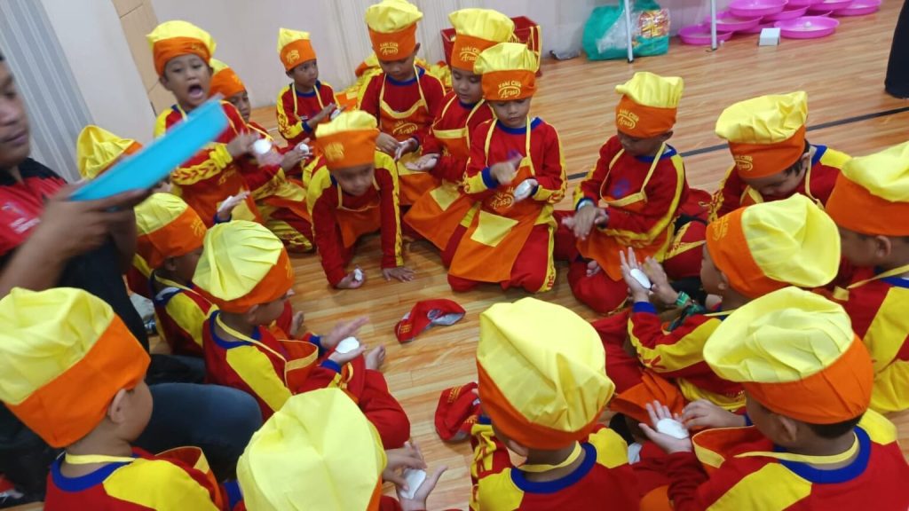 Para siswa kemudian dipakaikan celemek dan dibentuk menjadi beberapa kelompok. Masing-masing anak diberikan adonan tepung yang sudah siap, lalu diminta untuk memulihkan adonan tersebut, mengisinya dengan kacang hijau, dan membentuknya menjadi bulat-bulat. Tahap akhir adalah menempeli adonan dengan biji wijen.