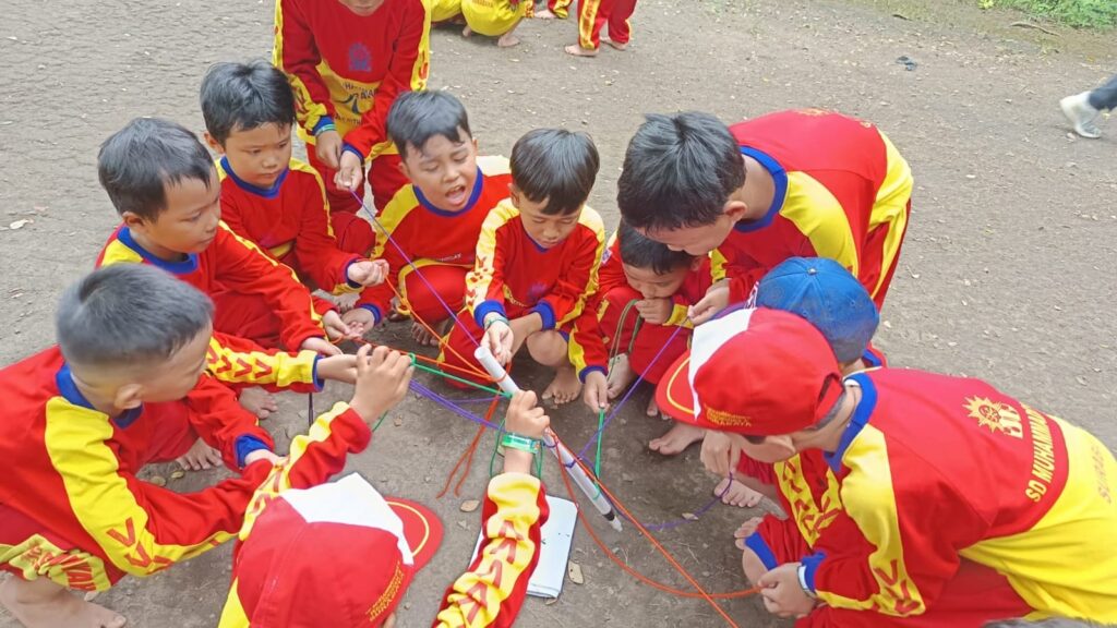 - Membuat bangun datar menggunakan spidol besar yang sudah terikat dengan tali, di mana tiap anak dalam kelompok memegang kendali tiap tali.